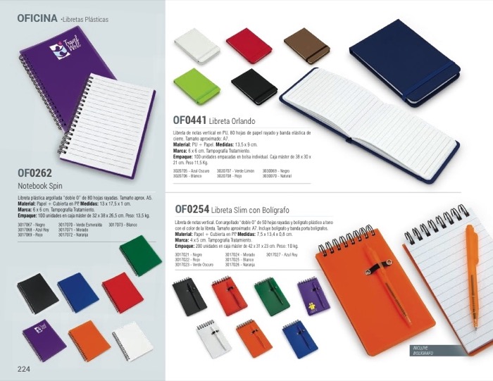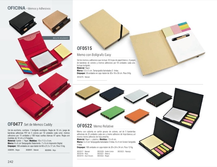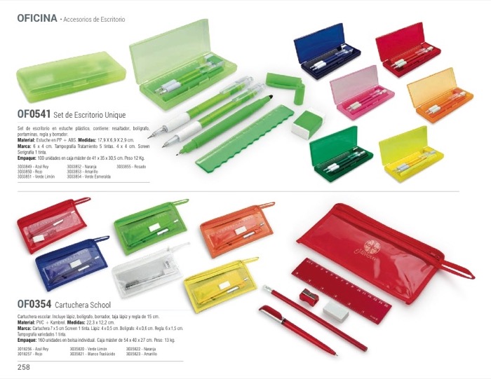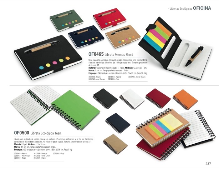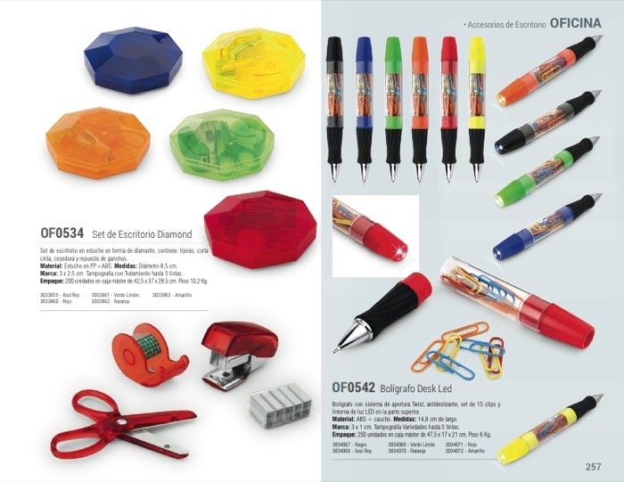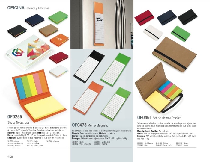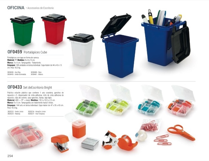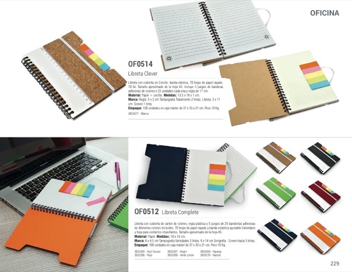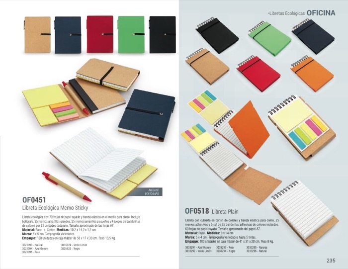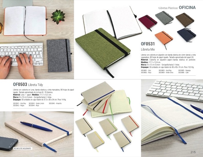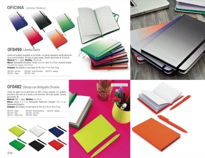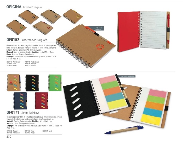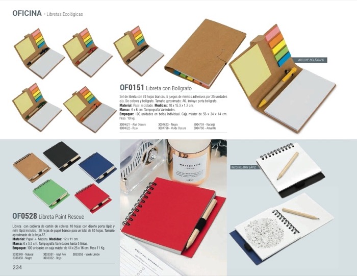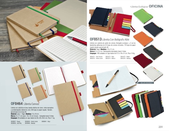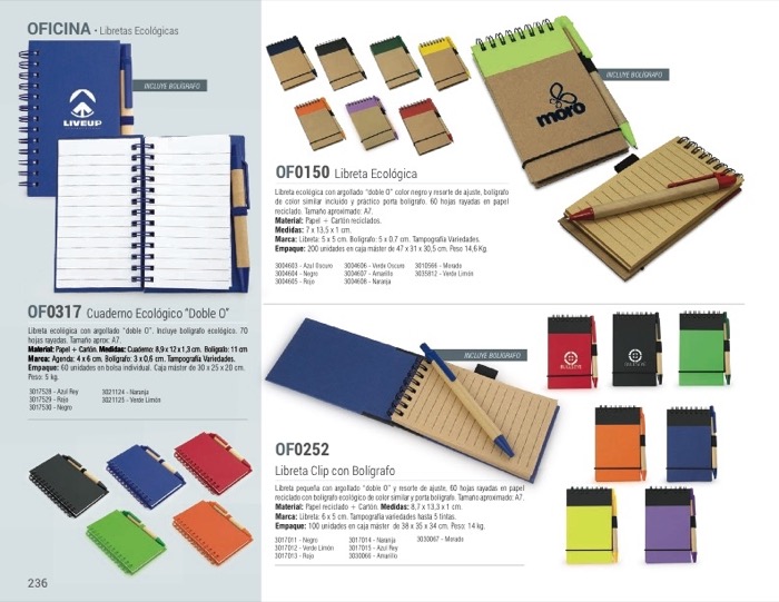 Libretas, cuadernos, carpetas, ecológicas, calculadoras, notas, sticker, separalibros, soporte de celulares, bolsas, tijeras, colores, set de oficina, lamparas de escritorio, alcancías, porta documentos, clips, tarjeteros, porta carteras, mouse pad, soporte de cinta pegante.