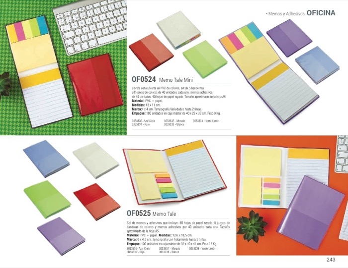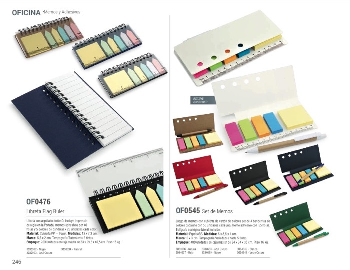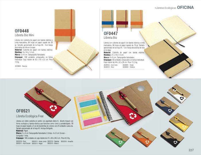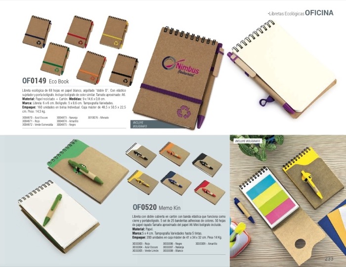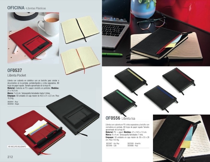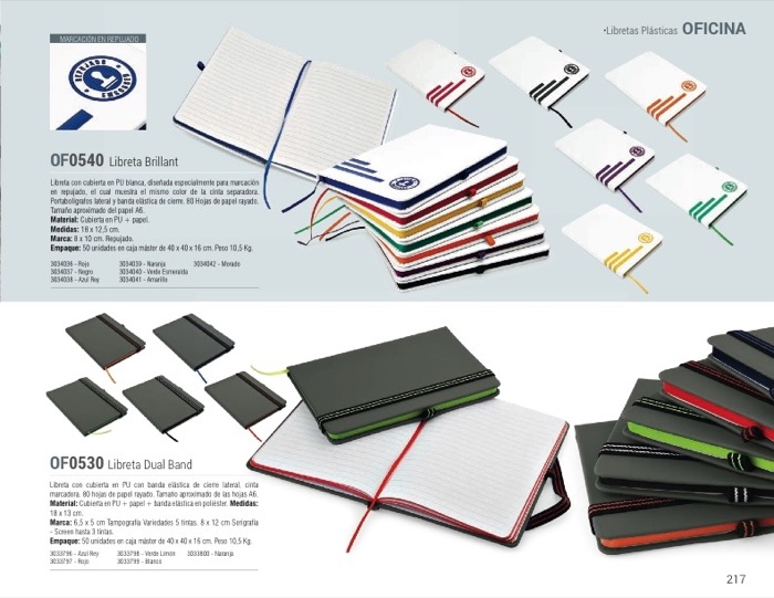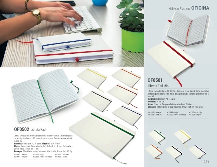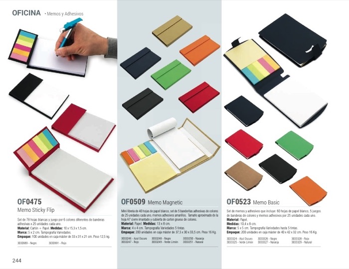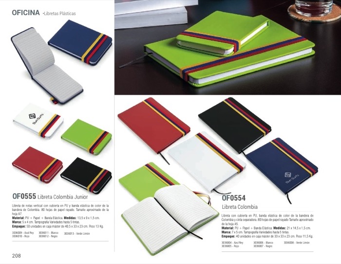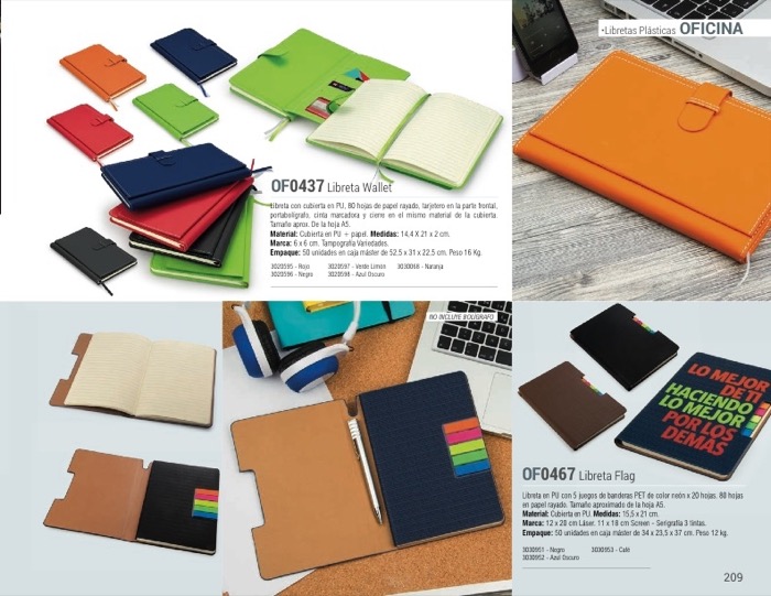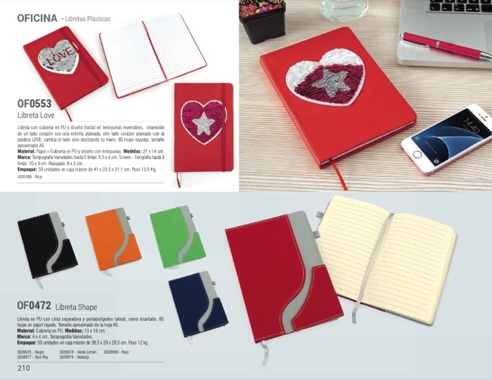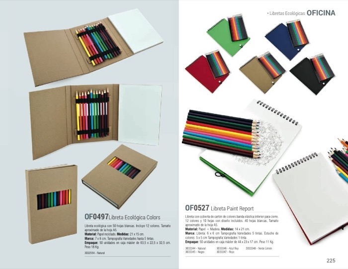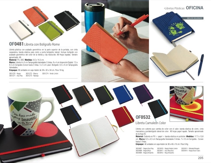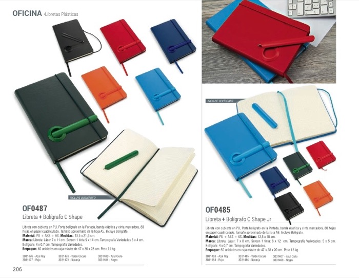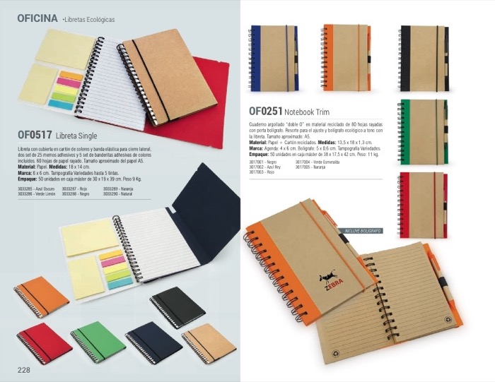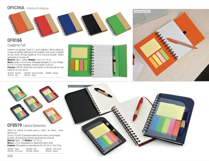 Libretas, cuadernos, carpetas, ecológicas, calculadoras, notas, sticker, separalibros, soporte de celulares, bolsas, tijeras, colores, set de oficina, lamparas de escritorio, alcancías, porta documentos, clips, tarjeteros, porta carteras, mouse pad, soporte de cinta pegante.