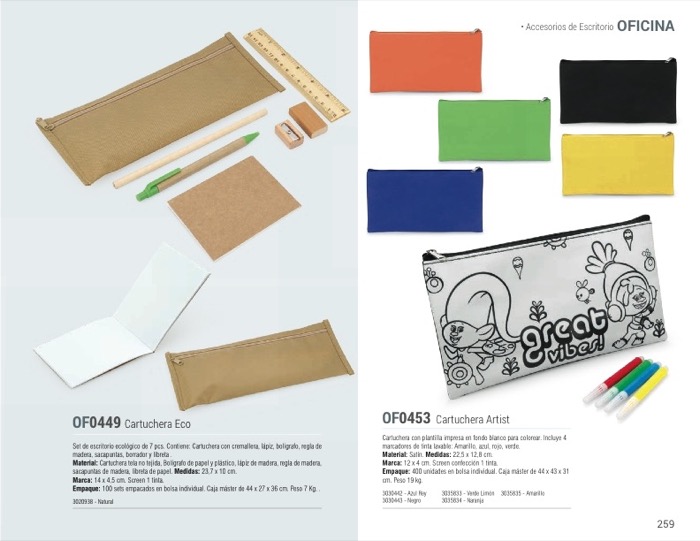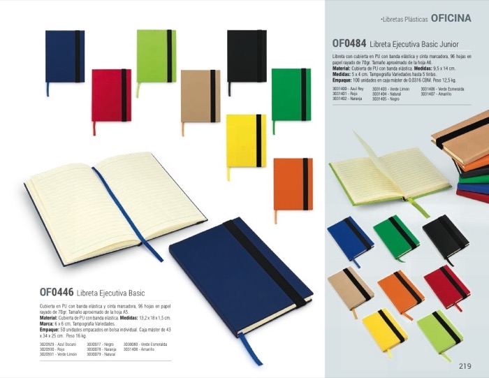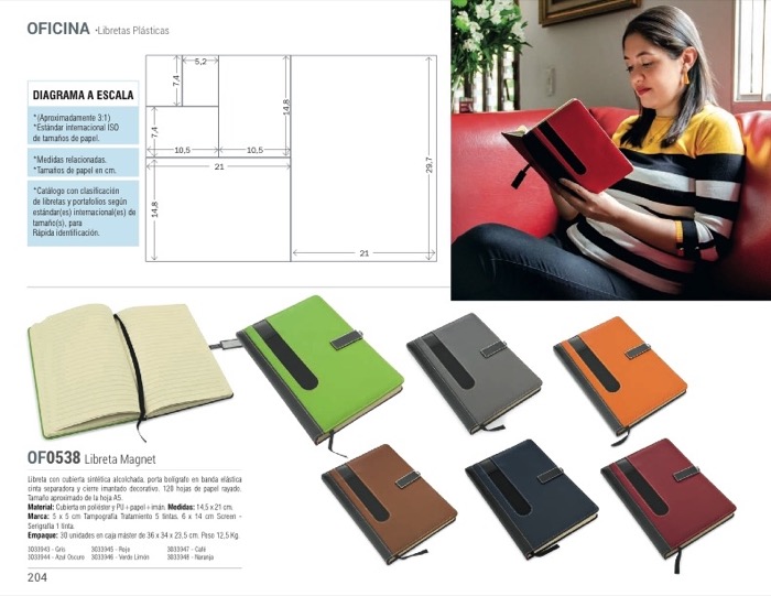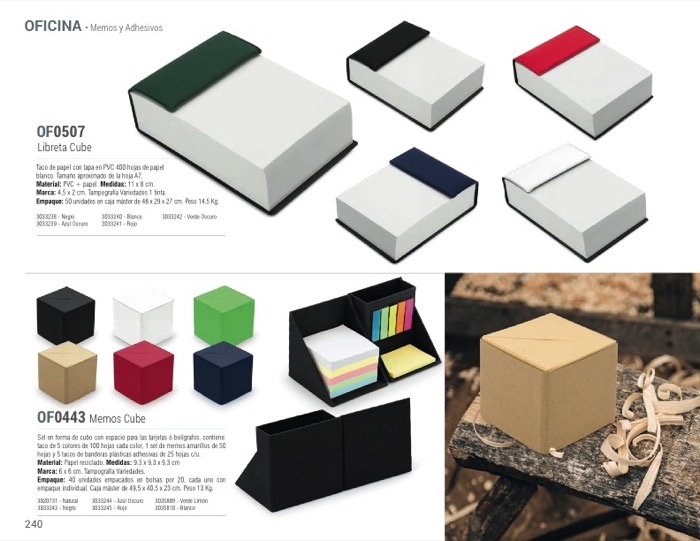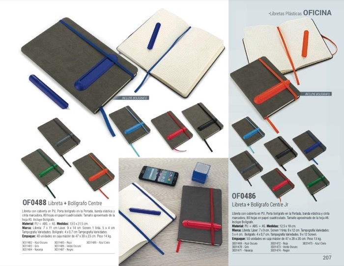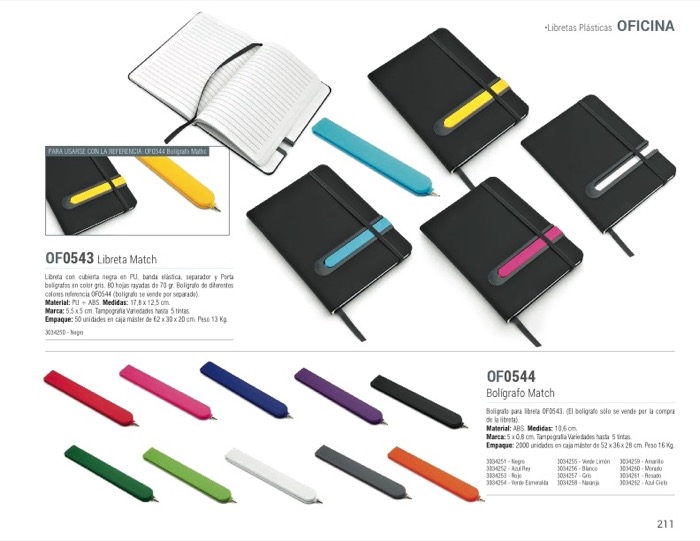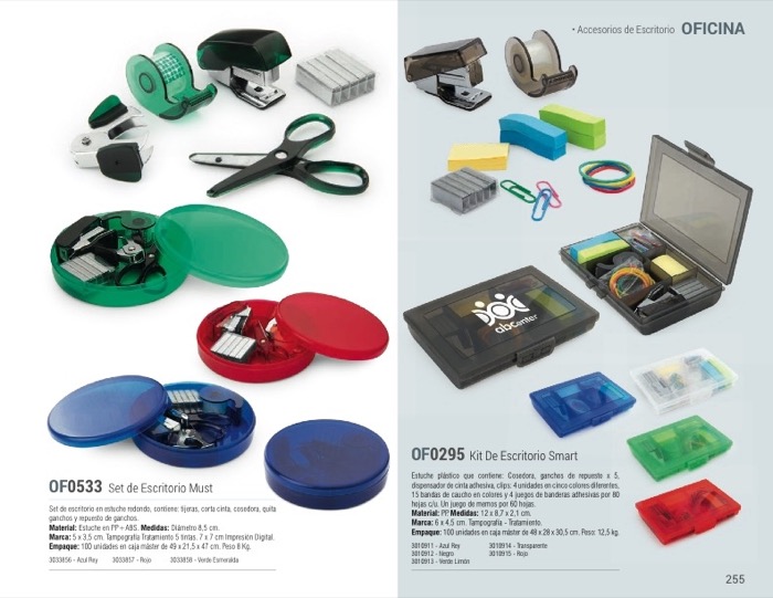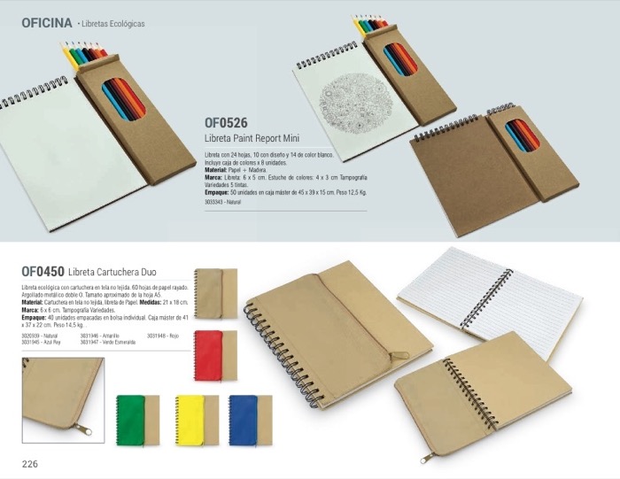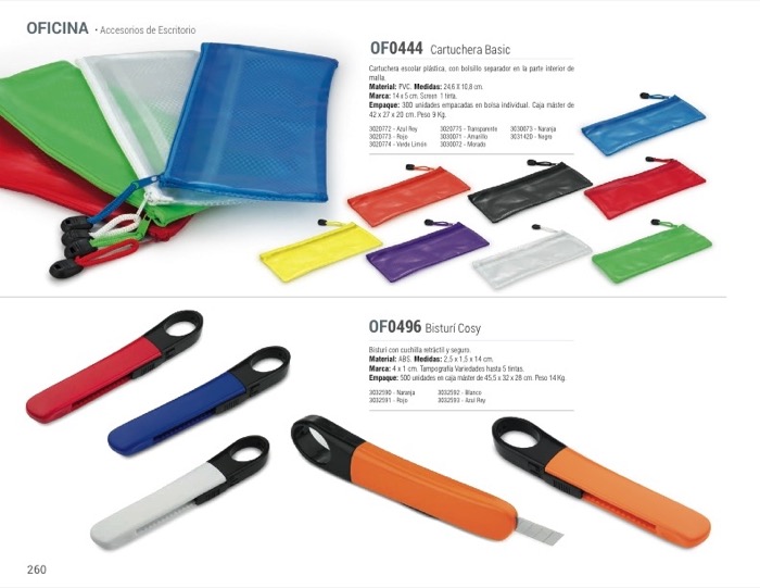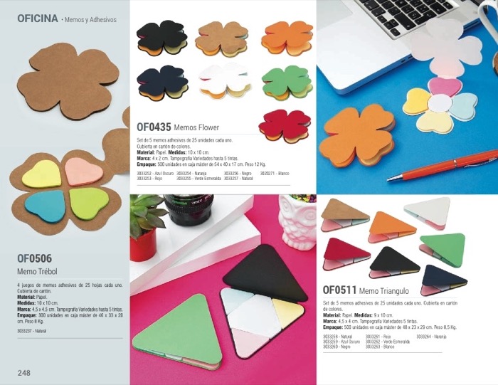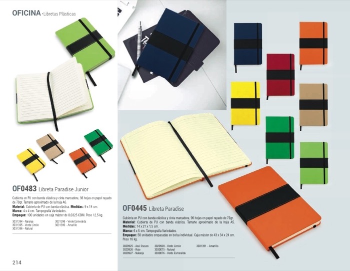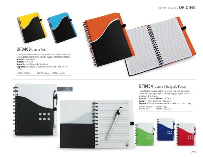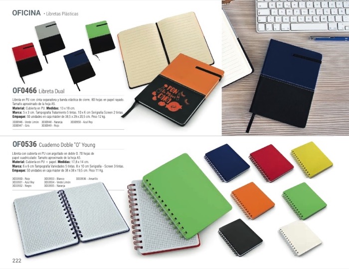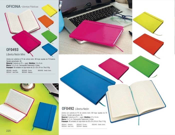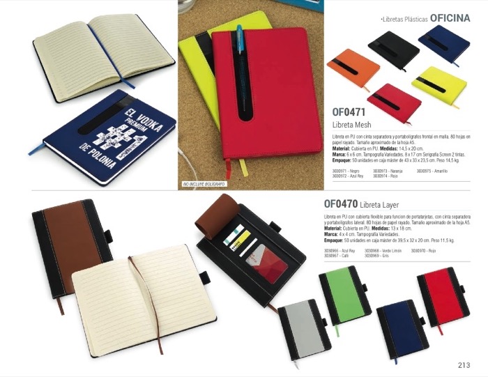Libretas, cuadernos, carpetas, ecológicas, calculadoras, notas, sticker, separalibros, soporte de celulares, bolsas, tijeras, colores, set de oficina, lamparas de escritorio, alcancías, porta documentos, clips, tarjeteros, porta carteras, mouse pad, soporte de cinta pegante.